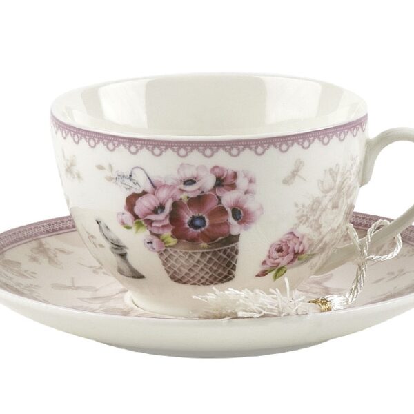 Czarująca filiżanka ze spodkiem Mia o pojemności 250ml.Doskonały produkt do serwowania kawy lub herbaty. Filiżanka i spodek posiadają bardzo bogate wzornictwo. Dopełnieniem piękna tego kubka jest subtelny frędzel na uchu i ozdobne pudełko.Wymiary filiżanki:wys. 6,5 cmszer. 9,5 cmWymiary spodka:wys. 2 cmszer. 15 cm