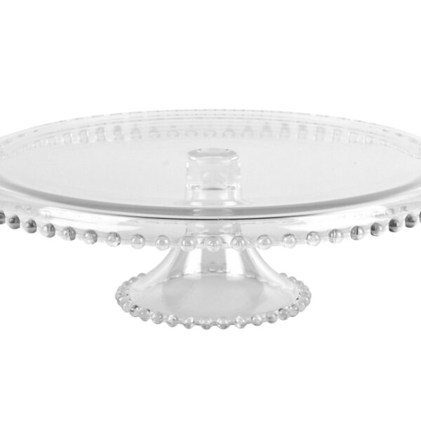 Rewelacyjna patera szklana zakończona subtelnymi kuleczkami zarówno na obrzeżach talerza jak i na podstawie nóżki.