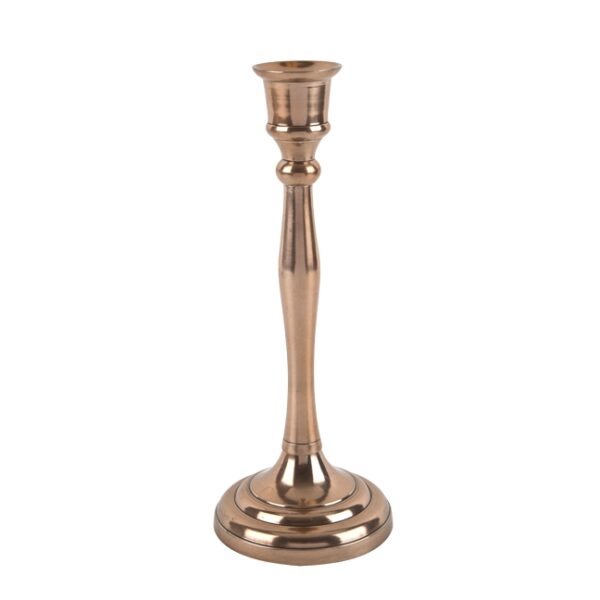 Pojedynczy świecznik w kolorze miedzi na tradycyjną świecę.Bardzo elegancko prezentuje się na stole, komodzie czy przy kominku.Miedziany kolor świecznika pozwala wkomponować go do wielu aranżacji niezależnie od stylu.