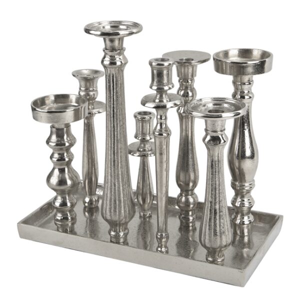 Aluminiowy świecznik ozdobny przeznaczony na 8 świec różnego typu.Świecznik pomieści 6 tradycyjnych świeczek typu stożek, a także dwie innego typu, np. w formie kuli lub walca.