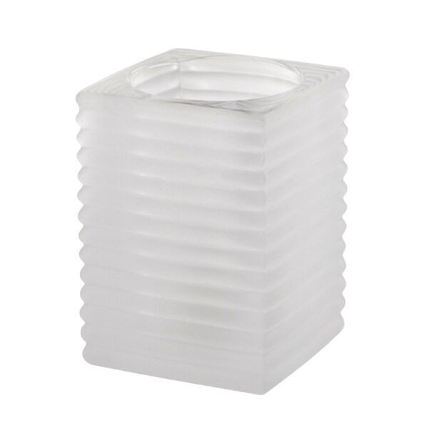 Szklany lampion w formie czworokątnej bryły.Posiada poziome pręgi na całej powierzchni.Wykonany został ze szkła, który przypomina zmrożone, matowe szkło.Bardzo ładnie się prezentuje.