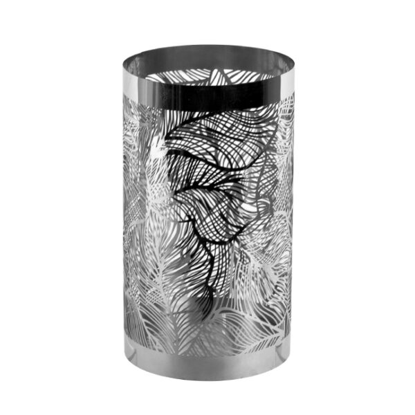 Efektowny lampion w modnym kolorze o odcieniu chromu.Posiada dekoracje z motywem liści na całej powierzchni.Lampion bardzo ładnie się prezentuje.Pasuje do stylowych oraz designerskich aranżacji.