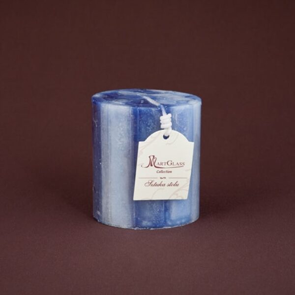 Świeca dekoracyjna w kształcie walca. Oryginalny kształt połączony z ciekawym niebieskim odcieniem świecy.