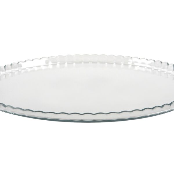 Okrągła, szklana patera z podniesionym obrzeżem.