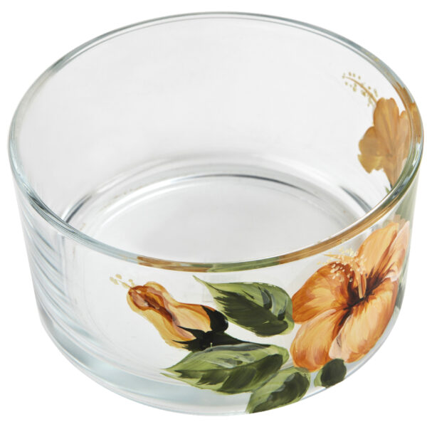 Salaterka z motywem kwiatów hibiskusa - odcienie żółtego, pomarańczy, zieleni i złota.