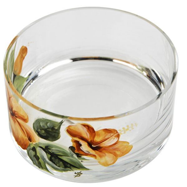 Salaterka z motywem kwiatów hibiskusa - odcienie żółtego, pomarańczy, zieleni i złota.