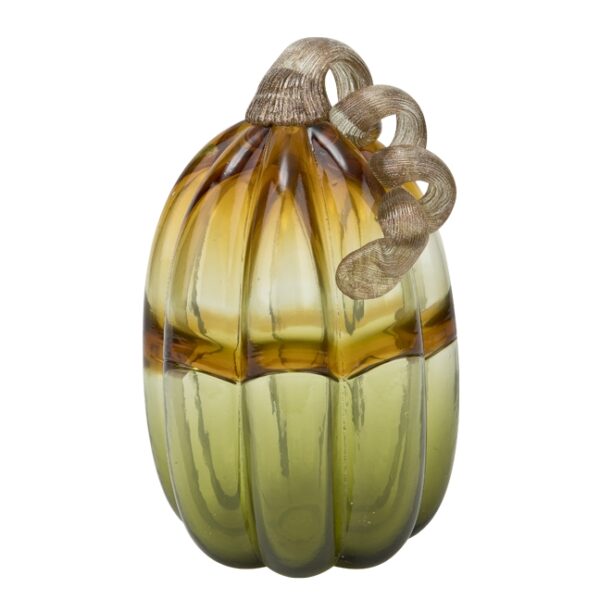 Dekoracja szklana w kształcie dynii. Produkt wykonany został z kolorowego szkła bardzo precyzyjnie, z dbałością o najmniejsze szczegóły. Jabłko przepięknie się prezentuje również za sprawą bursztynowo zielonego odcienia szkła.