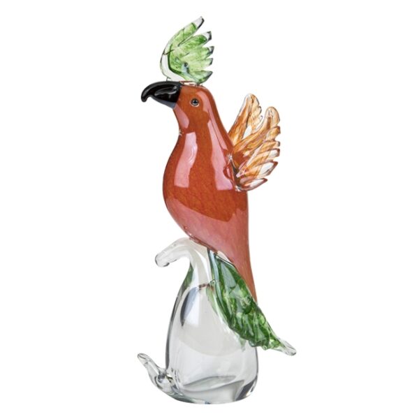 Dekoracja szklana w kształcie papugi. Produkt wykonany został z kolorowego szkła bardzo precyzyjnie, z dbałością o najmniejsze szczegóły. Papuga przepięknie się prezentuje również za sprawą ciekawych odcieni szkła.