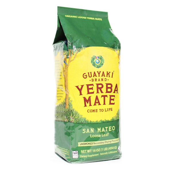 Yerba Mate Guayaki Organic San Mateo to organiczna mate o przyjemnym, delikatnym smaku. Składa się z listków suszonych powietrzem. Możemy w niej wyczuć przyjemny, klasyczny smak yerba mate, przeplatany orzeźwiającą nutą cytrusów i mięty, oraz świeżym akcentem sosny, trawy i lasu deszczowego. Yerba Mate Guayaki to świetna propozycja zarówno dla osób początkujących jak i zaawansowanych mateistów, preferujących umiarkowane pobudzenie.Yerba Mate Guayaki to produkt organiczny certyfikowany przez CCOF, USDA Organic. Certyfikat Fair Trade nadany przez szwajcarski IMO.Skład: 100% bio ostrokrzew paragwajski.Kraj pochodzenia: BrazyliaUwaga! Producent zmienił kolor opakowania z zielonego na żółte. Sposób zaparzania:Napełnij suszem naczynie od 1/2 do 3/4 objętości, następnie przykryj dłonią górną część naczynia.Odwróć naczynie i potrząśnij tak, by pył z suszu znalazł się na ręce.Delikatnie odwróć naczynie do pierwotnej pozycji, uważając, by zawartość nie zmieniła swego położenia.Umieść bombillę w naczyniu i zalej wodą o temperaturze 70-80 stopni Celsjusza.Odczekaj 2-3 minuty.Po tym czasie mate jest gotowa. Należy pić ją powoli przez bombillę. Naparu nie powinno się mieszać.