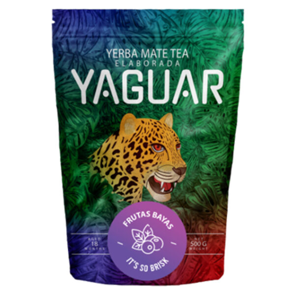 Yerba Mate Yaguar Frutas Bayas składa się z dużej ilości listków i patyczków oraz średniej ilości pyłu, a prócz tego w składzie znajdziemy truskawkę, bławatka, miętę, trawę cytrynową oraz naturalny aromat owoców jagodowych. W smaku możemy wyczuć lekko dymną nutę przeplataną mocno owocowym smakiem z delikatnie orzeźwiającym akcentem. Yerba jest delikatna w smaku, więc polecana jest szczególnie osobom rozpoczynającym przygodę z yerba mate. Świetnie sprawdzi się również parzona na zimno. Yerba suszona dymem, sezonowana przez około 18 miesięcy.Składniki: Ostrokrzew paragwajski,truskawka, bławatek, mięta, trawa cytrynowa, naturalny aromat. Kraj pochodzenia: ArgentynaSPOSÓB PARZENIA:Napełnij naczynie suszem do 3/4 objętości, następnie przykryj dłonią górną część naczynia. Odwróć naczynie i potrząśnij tak, by pył z suszu znalazł się na ręce. Delikatnie odwróć naczynie do pierwotnej pozycji, uważając, by zawartość nie zmieniła swego położenia. Umieść bombillę w naczyniu i zalej wodą o temperaturze 70-80 stopni Celsjusza. Odczekaj 2-3 minuty. Po tym czasie yerba mate jest już gotowa. Należy pić ją powoli przez bombillę. Naparu nie powinno się mieszać.