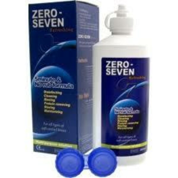 Wielofunkcyjny plyn dezynfekujący Zero Seven 500ml do pielęgnacji wszystkich miękkich soczewek kontaktowych. Czyści Dezynfekuje Wypłukuje Nawilża i konserwuje Usuwa osady białkowe bez konieczności pocierania soczewki (NO RUB)