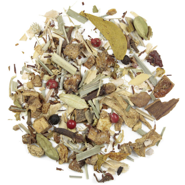 Ta pachnąca suszonymi owocami i cytryną mieszanka, dzięki bogactwu ziół użytych do jej przygotowania, dostarcza organizmowi pełnię składników potrzebnych dla jego prawidłowego funkcjonowania. Jej smak i aromat przypomina herbatę owocową w istocie, ta kompozycja ziołowa doskonale herbaty te zastępuje! Zawarty w suszu korzeń żeń-szenia to starożytne panaceum, któremu przypisywano moc przywracania sił i wigoru nawet szacownym starcom. Prócz tego niezwykłego ziela, autorzy mieszanki dodali do niej także: kawałki jabłka, rooibos, cynamon, skórki fasoli, imbir, trawę cytrynową, kardamon, goździki, czerwony pieprz oraz skórkę cytrynową.