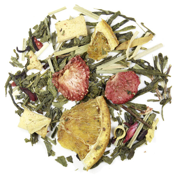 Powinniśmy zacząć od tego, że ta herbata oparta została na odmianie Sencha. Biorąc jednak pod uwagę ilość składników zawartych w tej mieszance należałoby powiedzieć raczej, że to susz Senczy został dołączony do nich, nie zaś na odwrót. Do dyspozycji naszych kubków smakowych oddano bowiem plastry suszonej truskawki, ćwiartki pomarańczy, kawałki jabłek, trawy cytrynowej a także kwiaty pomarańczy i hibiskusa. Ciemno zielone liście Senczy giną w ferii barw i zapachów, którymi raczą nas pozostałe składniki. Nie znaczy to jednak, że ta klasyczna japońska herbata nie gra tu kluczowej roli. O nie! To właśnie ona nadaje słodkiej, owocowej i nieco kwaskowatej kompozycji charakterystyczny ziołowy i miękki posmak. Dzięki temu właśnie Green Orange nie jest mimo bogactwa owoców typową herbatą owocową.Co godne odnotowania, także hibiskus, który tak często przecież potrafi zdominować mieszanki do których jest dodawany nie gra tu pierwszych skrzypiec. Jego kwaśnawy posmak, mimo że wyczuwalny ginie pod słodkim posmakiem truskawek i pomarańczy. Ta równowaga ale i różnorodność smaku czyni z Green Orange kompozycję deserową, idealną zarówno na słoneczne poranki, jak i na zimowe wspominanie ciepłych, wiosennych dni.