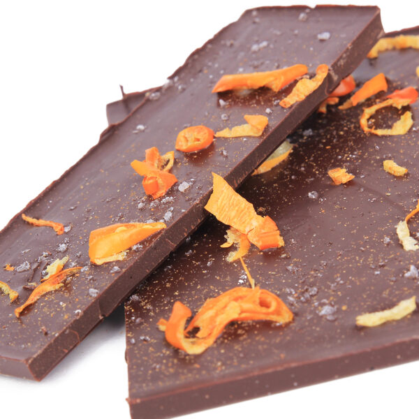 To doskonała propozycja dla osób odważnych, lubiących eksperymenty i niezwykłe połączenia smaków. Przyprawianie czekolady ostrą papryczką chilli to pomysł stary jak...starożytni Aztekowie! Głębia smaku najwyższej jakości ciemnej czekolady belgijskiej o pikantnym posmaku, wzbogaconej dodatkiem niewielkiej ilości soli morskiej sprawi, że ta wyrafinowana kompozycja usatysfakcjonuje nawet najbardziej wymagających smakoszy.Masa kakaowa w ciemnej czekoladzie minimum 60%. Zawiera soję. Może zawierać śladowe ilości mleka, orzechów, migdałów i zbóż.Waga: 85 g.