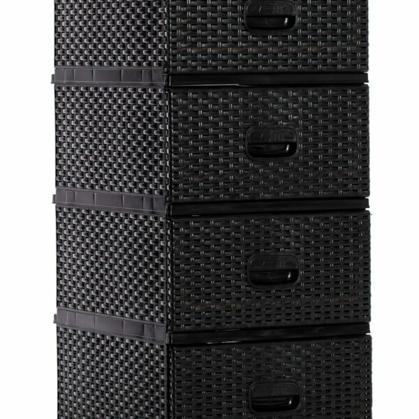 Regał Rattan to propozycja mebla ułatwiającego zorganizowanie naszych drobiazgów oraz większych przedmiotów. Stworzony został w wysokiej jakości tworzywa sztucznego, imitującego Rattan, więc jest niezwykle lekki - przy jego przenoszeniu spokojnie poradzi sobie nawet osoba starsza. Komoda ta jest bardzo pojemna, dzięki 4 szufladom, które zamykane są przy pomocy blokady. Dzięki nóżkom, mebel stoi bardzo stabilnie. Świetnie sprawdzi się w łazience, kuchni lub przedpokoju. Może także stanowić pomoc w zorganizowaniu miejsca w garażu, czy też piwnicy. Regał ten możemy złożyć w dowolny, preferowany przez użytkownika, sposób (każda z szuflad stanowi osobny element). Dostarczony mebel przeznaczony jest do samodzielnego montażu. Przed przystąpieniem do tego, zaleca się posmarowanie elementów kremem lub mydłem, co znacznie ułatwi proces składania. Do montażu nie potrzebujemy żadnych narzędzi! Dostępne kolory: Brązowy, Biały, Beżowy, Szary, Czarny Wymiary: wysokość: 90 cm szerokość: 37,5 cmgłębokość: 46 cm