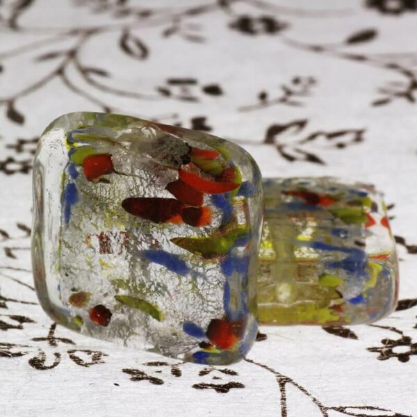 Koraliki kafelki ze szkła weneckiego. Srebrny środek jest nakrapiany kropelkami kolorowego szkła.