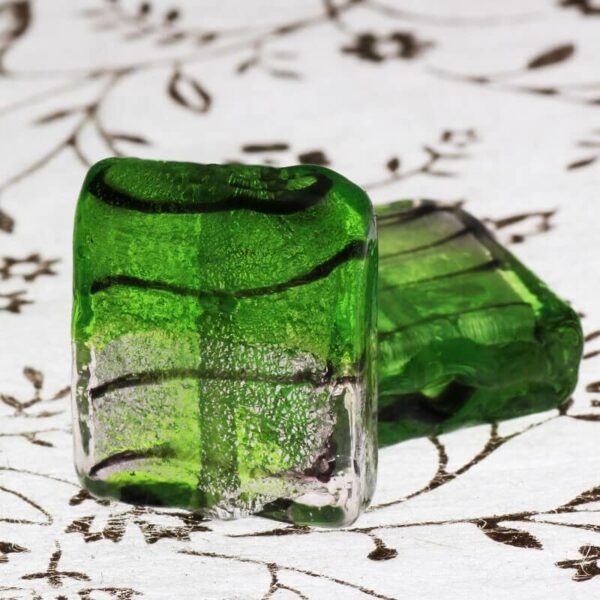 Koraliki kafelki ze szkła weneckiego. Srebrny środek jest opleciony spiralką ze szkła w kontrastującym kolorze. Dodatkowym efektem jest dwukolorowe szkło stanowiące bazę koralika.