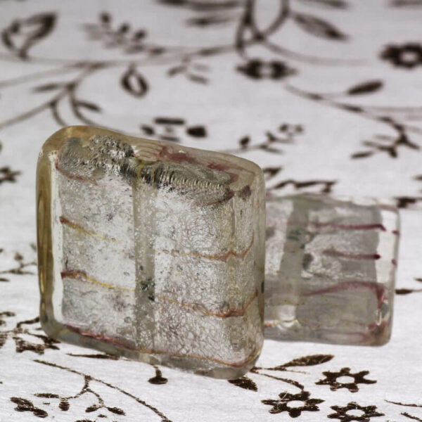 Koraliki kafelki ze szkła weneckiego. Srebrny środek jest opleciony spiralką ze szkła w kontrastującym kolorze.