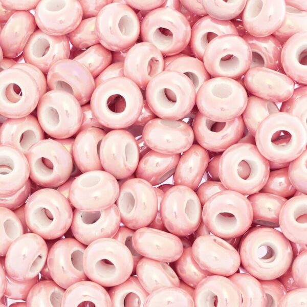Ceramiczne koraliki do biżuterii w kolorze sorbetu grejpfrutowego. Koraliki modułowe to nasze najpopularniejsze oponki. Można ich używać jako przekładek, koralików modułowych z wkładką metalową SMPANS lub dowolnie komponować z innymi koralikami w naszyjnikach i bransoletkach. Koraliki są kilkukrotnie wypalane w wysokich temperaturach z domieszką porcelany co podwyższa ich trwałość i nasycenie kolorem.