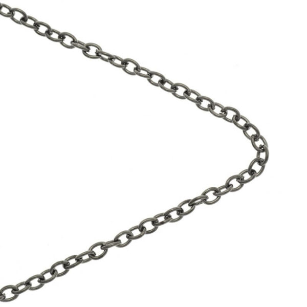 Łańcuszek typu ankier w kolorze antracytowym. Wykonany z równych, owalnych oczek o wymiarach 2.5 mm na 3 mm. Grubość drutu to 0,6mm. Łańcuszki bardzo starannie wykonane, z powłoką przedłużającą trwałość. Sprzedawane na metry, ze szpuli w jednym kawałku. Łańcuszki delikatne, idealne na naszyjniki. Szpula 90m.