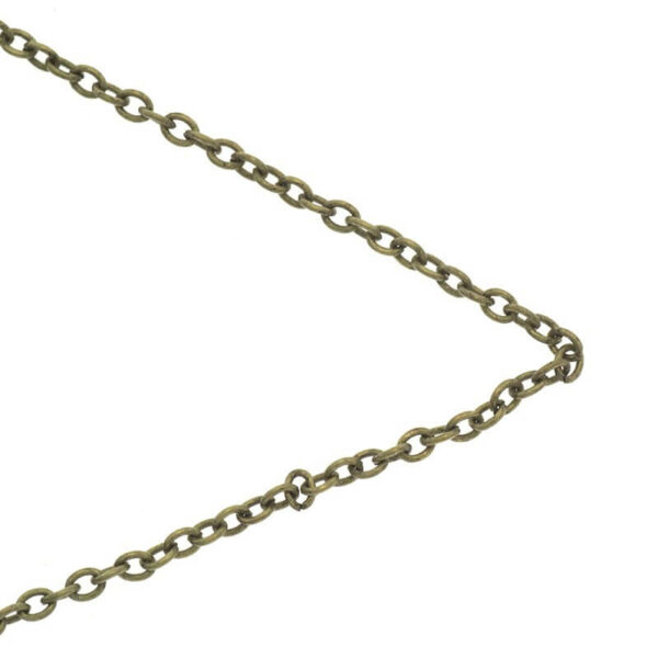 Łańcuszek do biżuterii w kolorze antycznego brązu. Ładne równe oczka o wymiarach 2mm na 3mm z okrągłego drutu nadają mu szlachetnej formy. Wypłaszczone oczka łańcuszka ciekawie odbijają światło. Łańcuszek sprzedawany ze szpuli w jednym kawałku, niezależnie od ilości zakupionych metrów.