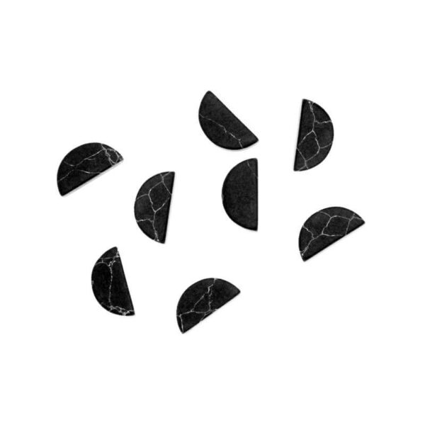 Kaboszon pół- księżyc, z dwóch stron płaski o wymiarach 12 x 5 mm wykonany z howlitu w kolorze czarnym. Kaboszon może być oczkiem w pierścionku, kolczykach sztyftach lub malej zawieszce.
