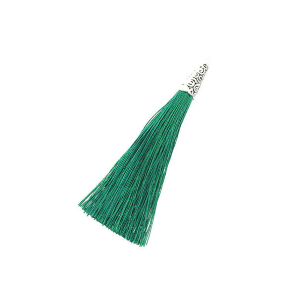 Chwosty dekoracyjne wiskozowe z czapeczką, gotowe do zamontowania w kolczykach, brelokach, zawieszkach. Chwosty w kolorze soczystej zieleni, dość długie znajdą zapewne wiele zastosowań w biżuteryjnych cackach. Okucie w kolorze antycznego srebra, z dodatkowym haczykiem do montażu. Pasuje się do srebrnych i platynowych dodatków.