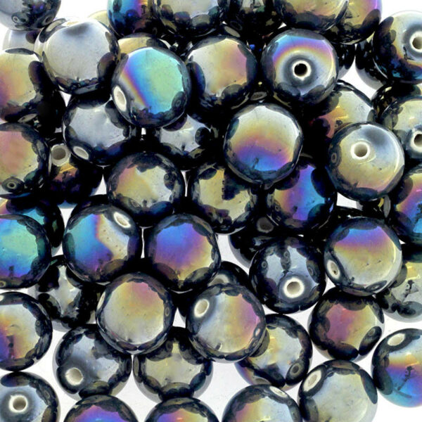 Koraliki ceramiczne, kulki 18 mm, w kolorze szarym z dodatkową warstwą opalizującą.