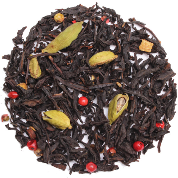 Niezwykle rozgrzewająca mieszanka na bazie czarnej cejlońskiej herbaty z dodatkiem bergamotki, która mocno akcentuje swoją obecność zarówno w suszu jak i naparze.Oprócz charakterystycznego zapachu w mieszance znajdziemy delikatnie przebijające się nuty kardamonu, który słynie między innymi ze swych właściwości rozgrzewających. W składzie znajduje się również czerwony pieprz. Jego pikantny akcent idealnie łączy się z ostro-słodkim, korzennym smakiem kardamonu i neutralną bazą czarnej herbaty.Kompozycja idealna na zimniejsze dni podczas których rozgrzeje i upoi nas aromatem.