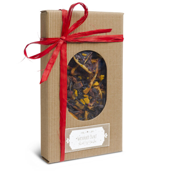 Podarunek stworzony na wzór tradycyjnych czekoladek z okienkiem. W specjalnie zaprojektowanym pudełku znajduje się 50 gram herbaty Opowieść Wigilijna - idealna na mroźne wieczory. Na opakowaniu, które wykonane jest z eleganckiej tektury falistej dołączony został bilecik "Wesołych Świąt", a całość została przewiązana satynową wstążką. Prezent idealny jako dodatek do pozostałych, lub jako samodzielny niezobowiązujący. Prostota i elegancja połączona z pyszną herbatą.