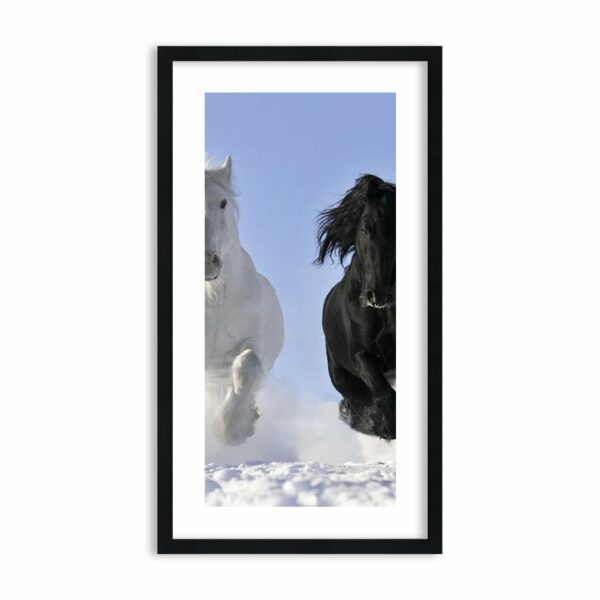 Cóż piękniejszego nad konie w galopie! Czarny i biały koń na białym śniegu! A w tle błękitne niebo… Udaj się na wyprawę razem z nimi…