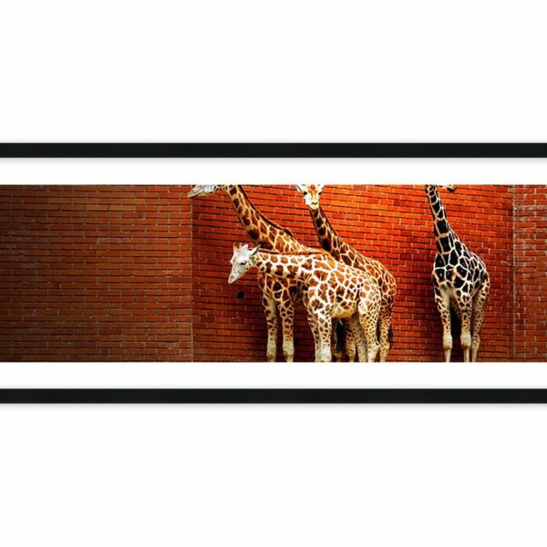 Smukłe, wysokie, piękne zwierzęta, symbol Afryki. Żyrafy wyciągające swoje długie szyle, by odkryć co dzieje się za rogiem. Zwierzęta na tle ceglanego muru wywołują uśmiech na twarzy...