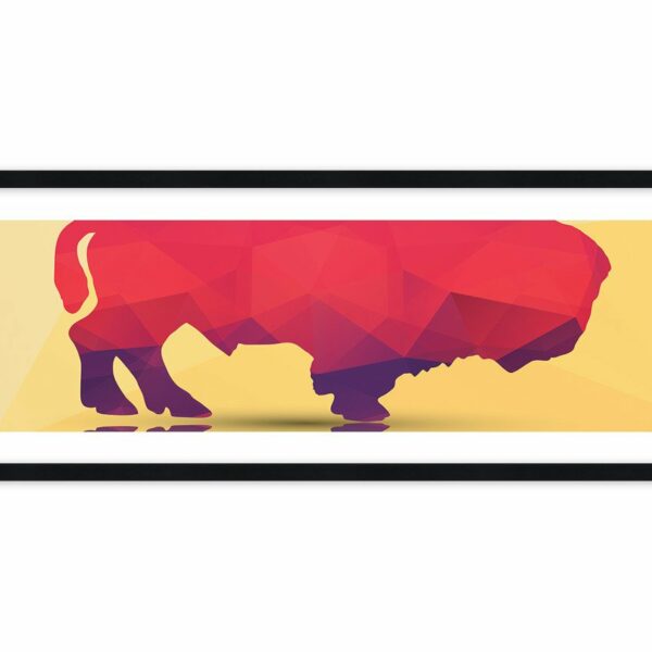 Majestatyczny, potężny żubr spacerujący po puszczy. Ceglasto-amarantowe wielokąty odcinają się na słoneczno-piaskowym tle…