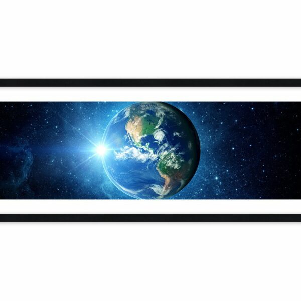Błękitna planeta z zielonymi kontynentami w promieniach wschodzącego słońca i rozgwieżdżonego sklepienia nieba. Spójrz na ten taniec planety, gwiazd i słońca…