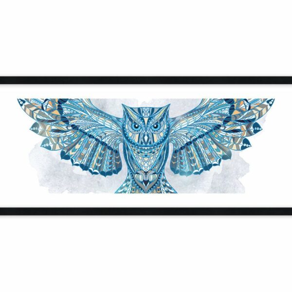 Ornamentowa sowa z rozpostartymi skrzydłami, niczym witraż na biało-błękitnym tle. A skrzydła jak u orła...