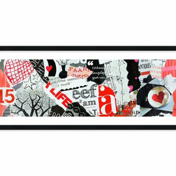 Biało-czarno-czerwony kolaż fragmentów plakatów i gazet, wśród których odnajdziesz drzewo, wazon z kwiatami i delikatne motyle. Niech ten wesoły mix rozweseli wnętrze twojego domu…