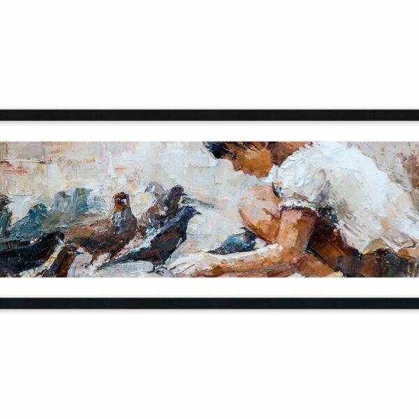 Śliczny, olejny obraz dziewczynki karmiącej gołębie. Spójrz jak rozczulający jest to widok. Po prostu wspomnienie dzieciństwa...