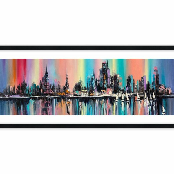 Panorama wielkiego miasta spowita we wszystkie kolory tęczy. Spójrz jak pięknie odbijają się zabudowania i te kolory w spokojnych wodach rzeki Hudson…