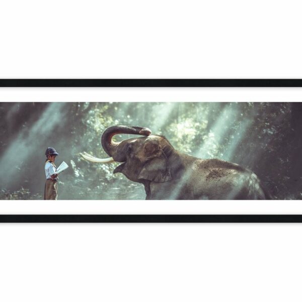 Spotkanie giganta z maluchem. Spolegliwy słoń slucha opowieści małego chłopca czytającego ciekawą historię i zanosi si eśmiechem tak, że aż rzuca trąbą. A wszystko w skąpanej w słońcu dżungli…