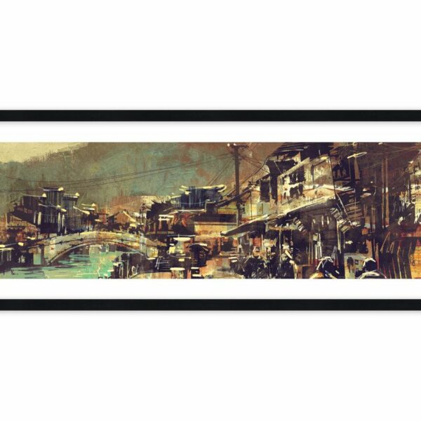Osada rybacka, niedaleki most łączący dwa brzegi rzeki. Małe domy, linie elektryczne i przechodzący w pośpiechu ludzie pokazują industrialny charakter obrazu…