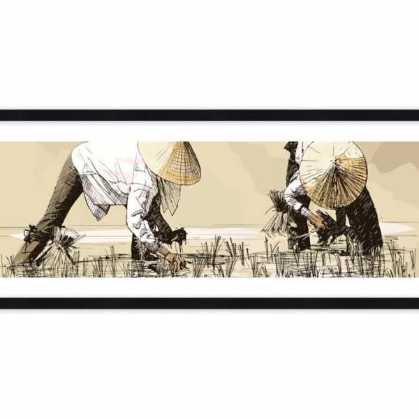 Charakterystycne kapelusze, brodzenie w wodzie i zbiory ryżu. Rycina pokazuje trud wykonywanej pracy. Ale najważniejszy jest zbiór…