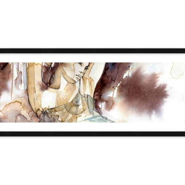 Ukryty akt w haremie. Delikatna dziewczyna w kolorze beżu i lilaróż, wśród akwarelowych plam. Rycina i kreski pokazują delikatność tego wizerunku…
