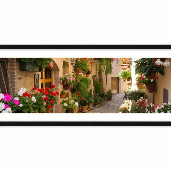 Przeurocza, wybrukowana uliczka w południowe Francji, lub Włoszech, z domami z kamienia. Całość ozdobiona kwiatami w doniczkach, w skrzynkach. Ilość kwiatów w tym miejscu po prostu zachwyca i upaja zapachem…