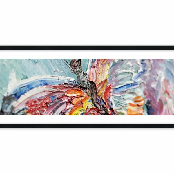 Multikolorowy motyl na błękitno-fioletowym tle. Grube pociągnięcia pędzla sprawiają, że motyl praktycznie zrywa się do lotu. Podziwiaj tę ulotną lekkość…
