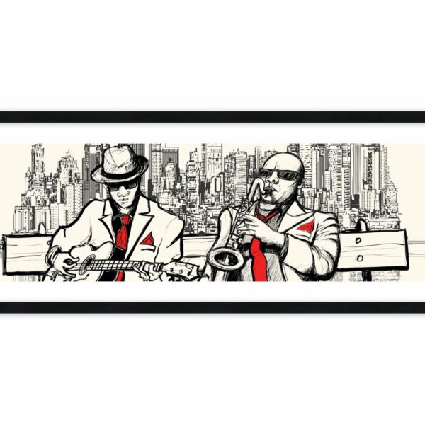 Czerwone krawaty, białe marynarki i instrumenty. Uliczny band grający jazz. Posłuchaj tej fantastycznej muzyki i daj się zauroczyć amerykańską ulicą, brzmieniem gitary i trąbki…