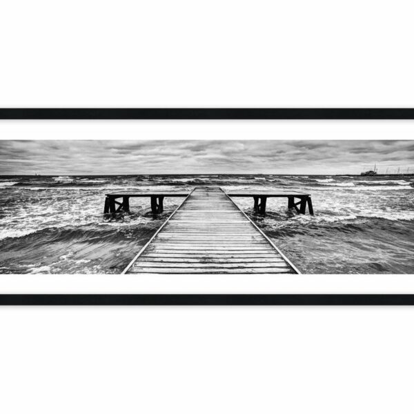 Nostalgia w kolorach szarości. Drewniany pomost z szeroką kładką na końcu. Spójrz na to wzburzone morze, wiejący wiatr i odważ się pójść na koniec pomostu, by rozkoszować się dziką naturą…