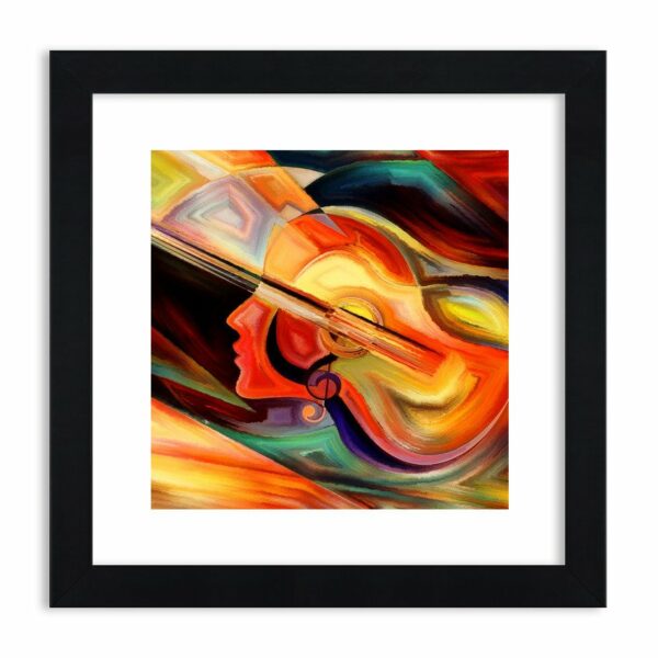 Twarz ukryta w gitarze. Klucz wiolinowy w roli kolczyka zwraca uwagę. Zwróć uwagę na połączenie barw i form. Przenikające się kolory oddają doskonałość kształtów…