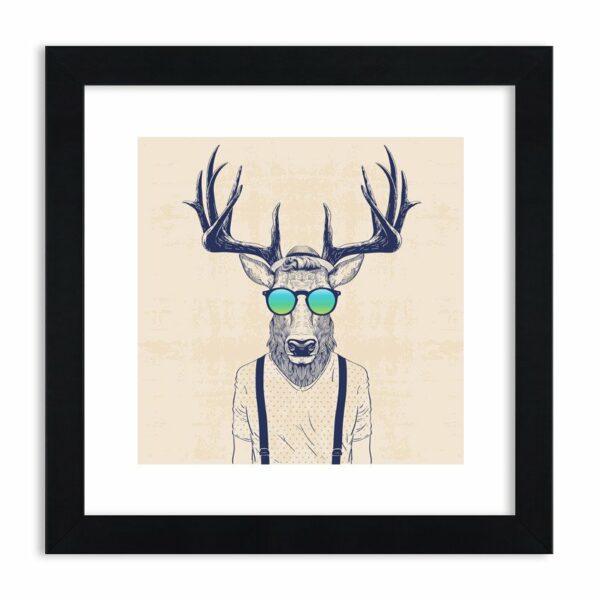 Tym razem jeleń w okularach i kapeluszu. Monochromatyczna kompozycja rozweselona jest niebiesko-zielonymi okularami. Ot, taki żart…