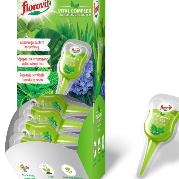 Florovit Vital Complex to nowoczesny i gotowy do użycia preparat przeznaczony do roślin domowych ozdobnych z liści. Specjalnie opracowany kompleks składników wzmacniających poprawia witalność i kondycję roślin, wspomaga system korzeniowy oraz wpływa na intensywne wybarwienie liści. Regularne stosowanie poprawia kondycję podłoża i pozytywnie wpływa na naturalną odporność roślin.Wspomaga system korzeniowy.Wpływa na intensywne wybarwienie liści.Poprawia witalność i kondycję roślin.Sposób użycia: Należy odłamać końcówkę w miejscu nacięcia i umieścić wylot aplikatora w podłożu tak, aby preparat swobodnie wypływał. Czas opróżnienia zależy od jakości i wilgotności podłoża.Florovit Vital Complex można używać przez cały rok. Stosować 1 raz w miesiącu, 1 aplikator na 1 roślinę. Należy pamiętać o regularnym podlewaniu roślin.
