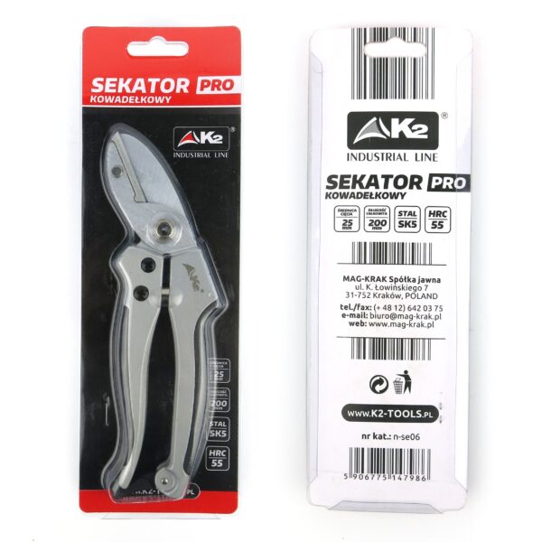 K2 sekator kowadełkowy PRO N-SE06 nadający się doskonale do pracy w ogrodzie. Nadaje się do cięcia gałązek o grubości 25mm. Posiada antypoślizgowe gumowe rączki co umożliwia łatwośc pracy. Ostrza wykonane z chromowanej stali, które pozwolą na długo cieszyc się z użyteczności sekatora.Średnica cięcia 25mmDługość całkowita 200mmKod producenta: N-SE06Numer produktu: 80236